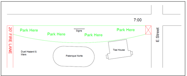 When you arrive, please park in the GREEN area in the image below (in front of the Tea House and Palenque Norte Tent). DO NOT park in the street!