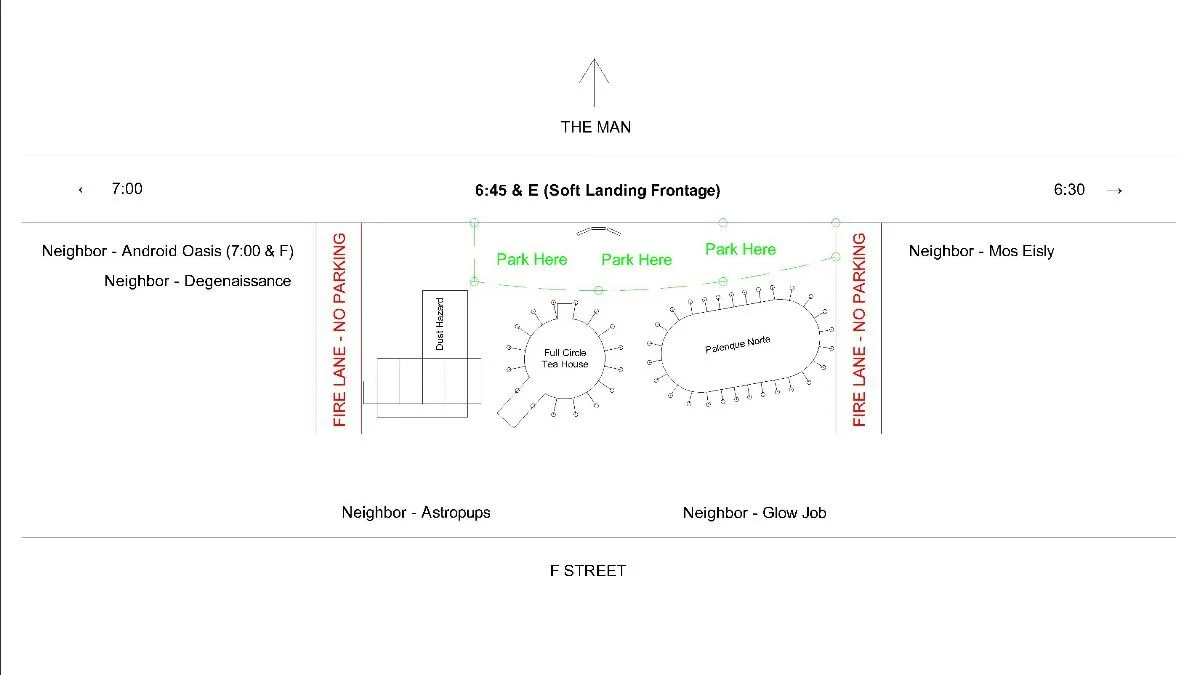 As you come to Playa, please be vigilant with speed limits and darkwads that are in the city. It will be dusty and hard to see when you arrive! As you approach camp (on E Street, in the middle of 6:30 and 7:00), there are a few important items to help you with your arrival.